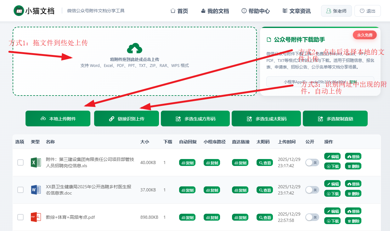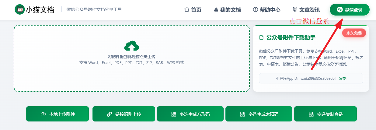 小猫文档是一个公众号附件文件下载的服务,通过方便快捷的功能,只需要将文件简单上传到小猫文档,就可以让公众号文章拥有文件下载的功能,无需引导用户点击公众号文章的“阅读原文”然后跳转到网页页面去下载文件,用户体检拉满。简单方便,用户无需跳转,直接在线查看或下载公众号文章中的附件。